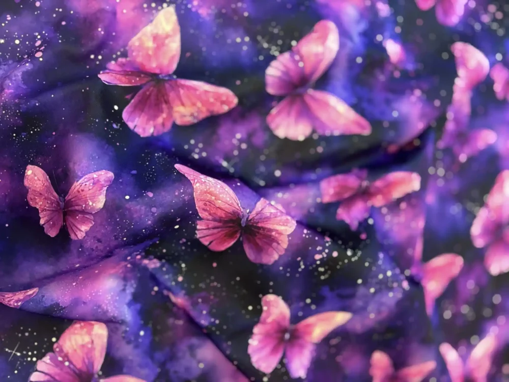 Tento zimní softshell vás vezme do jiného světa – fialoví motýli se vznášejí na galaktickém pozadí plném hvězd.